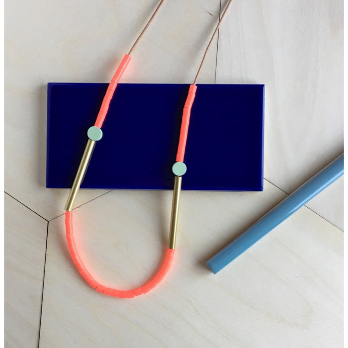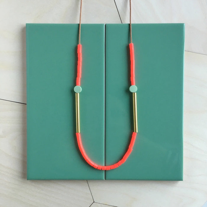 Bright vivid coral colour beads with handmade mint green disc beads and brass tube detail on a natural leather cord.