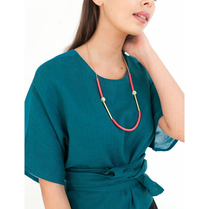 Leuchtend-lebendige Korallenfarben-Perlen mit handgefertigten mintgrünen Scheibenperlen und Messingrohr-Details an einem Naturlederband.